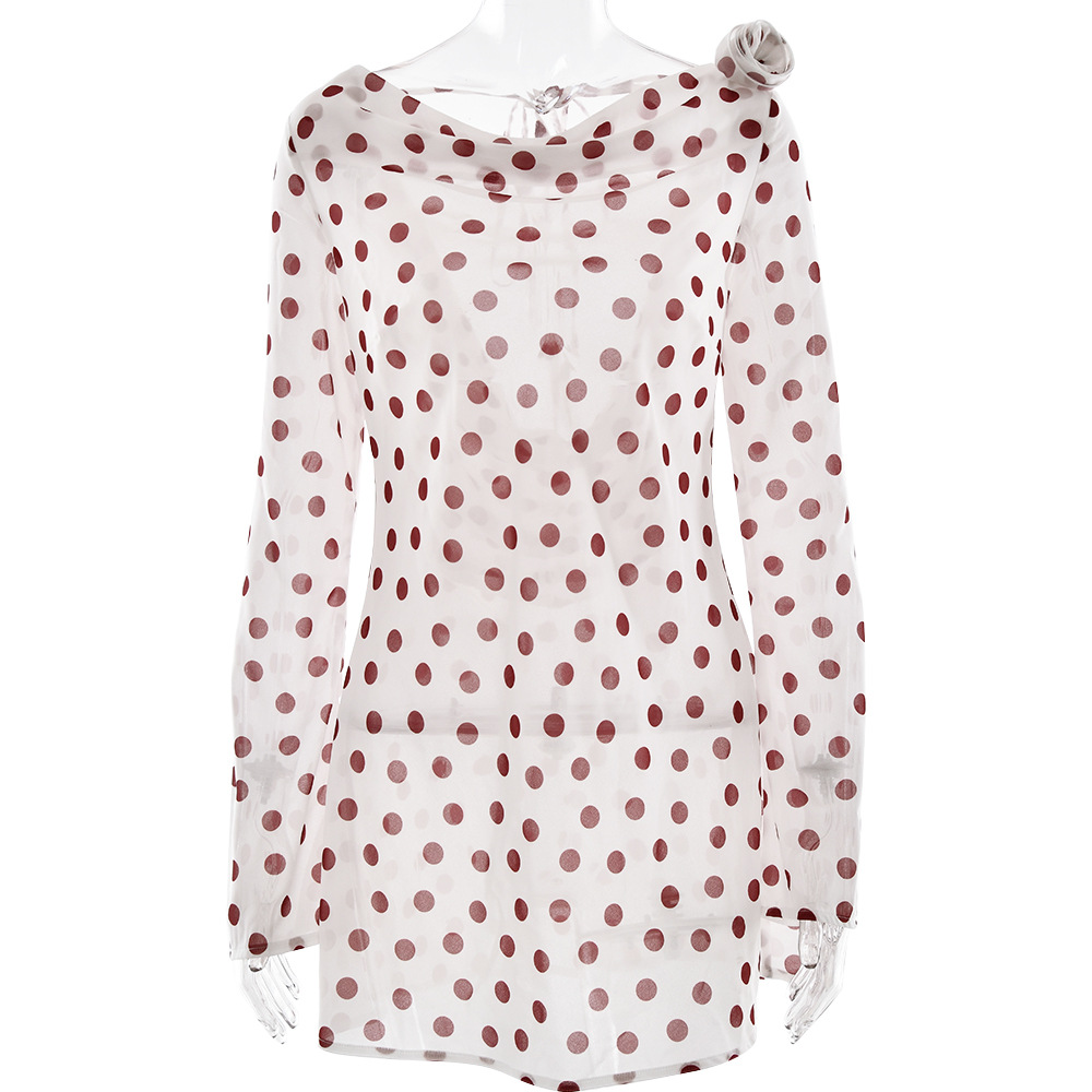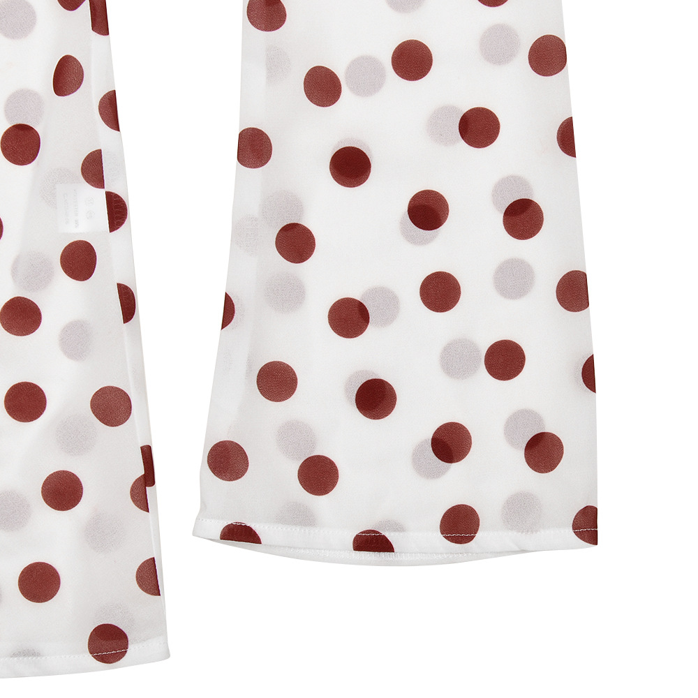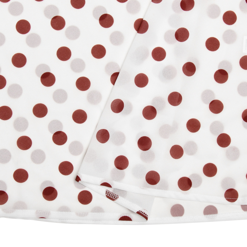 Color: Red, made from chiffon fabric with a polka-dot ruffled neckline