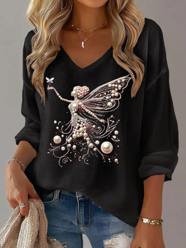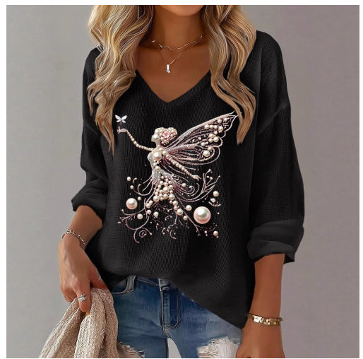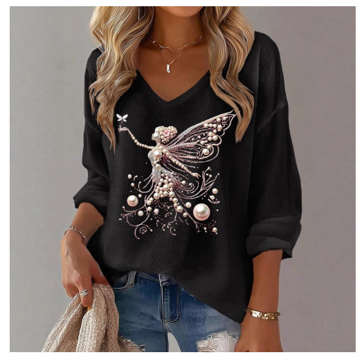 Womens Printed Loose V-Neck Top